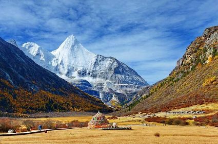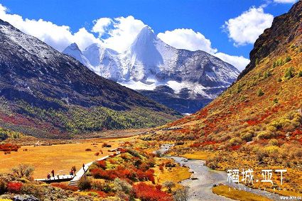 尤其亞丁匯集了稻城秋天所有濃烈的顏色:純凈的藍天,飛過白云間的蒼鷹,風(fēng)格獨特的藏鄉(xiāng)建筑,金黃的秋楊,深紅的沼澤,波光粼粼的小河,多么美的一幅油畫,是人們歸隱田園的夢想天堂。