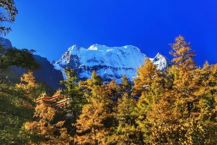 冰晶潔白的央邁勇傲立于天地之間,直指云霄,氣勢磅礴,讓人肅然起敬。山下,寬闊的峽谷像一條玉帶,環(huán)繞著神山,郁蔥的深林,野花盛開的草地、潺潺的溪流在雪山腳下映襯著壯觀的山峰。