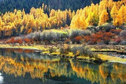 珍珠海周邊層林盡染,圍繞海子一圈,和雪山一起倒影湖面,分不清天空和水下,分不清上下真實。