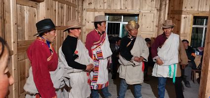 夜臨了,月低垂,整條山谷陷入了藍色的世界,近處是墨綠,遠處是淡綠,雄渾的大山在綠的撫摸下也變得婀娜起來;古老寨子的火塘也燃起來了,勞作了一天的普米人聚在一起,跳起了原始氏族人群圍火而舞的傳統(tǒng)舞蹈,曲調悠揚且古樸動人。