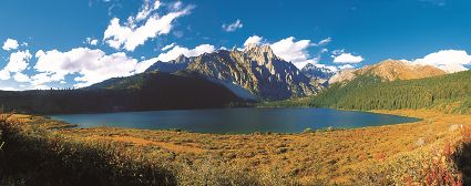 措普湖海拔4000米,屬第四紀(jì)冰磧湖,清澈碧藍(lán),為森林與草甸所環(huán)繞。湖泊東北岸的扎金甲博神山,巍峨壯觀。措普寺坐落在湖邊,寺廟、森林和湖光山色相交融,猶如仙境。