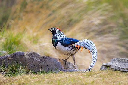 4月16日,筆者在康定市雅拉鄉(xiāng)境內(nèi),再次拍攝到國家二級保護(hù)動物白腹錦雞求偶的清晰視頻。一只色彩斑斕的雄鳥,拖著黑白相間的云狀斑紋尾羽,圍著雌鳥跳起了“圓舞曲”。整個求偶過程有十多分鐘。每年三至五月是白腹錦雞求偶期。