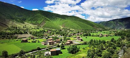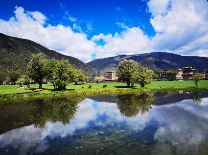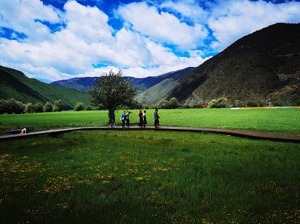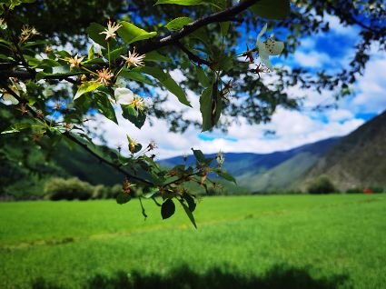 夏日,暖陽溫柔,沿途入眼皆是綠意。聽說,俄色花盛放的時候,潔白的花成簇成團,一樹樹漫山遍野,像九天的云朵堆滿山谷田野,汽車從公路疾馳,風里都是俄色的清香。我們來的時候稍微遲了,錯過了俄色的花期,花開荼蘼,殘花在蒼翠的枝葉里躲藏,風里是飛舞的花瓣,紛紛揚揚,在棕紅的棧道鋪成白色的云錦,樹下是芬芳的余味。棧道邊,金黃的雪白的野花鋪灑在翠綠的草甸上,像濃烈的水彩。地里的青稞,綠得晃人眼睛,綿延的是木雅人勤勞與希望。遠處,木雅民居在各種深綠淺綠的陪襯下更加的濃墨重彩。