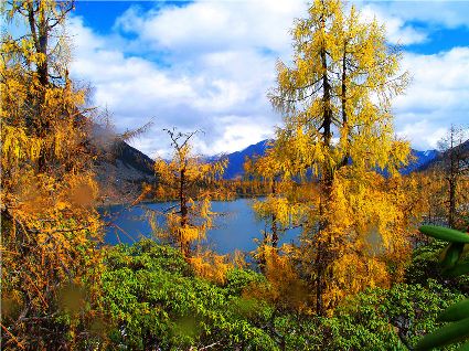 丹巴的秋是有著美麗色彩的季節(jié),你瞧,在峽谷兩岸的山巔,那一簇簇綠樹在一夜之間竟然點綴上了黃的、紅的顏料,就像是一名丹青能手不小心間打翻了調(diào)色盤,讓那些靈動的顏料在樹冠上潑灑。黃色的樹葉正印證了“滿樹盡帶黃金甲”的意境,黃得透徹,黃得潔凈。而那些紅色的樹葉,猶如盛開的鮮花,在逐漸蕭條的秋日里顯露出勃勃生機(jī)……那一片片黃紅綠相間的顏色,一寸一寸的往下挪移,讓看慣了春色綠野滿山的人們驚呼大自然的鬼斧神功之作。山腰,蔥綠的樹一棵連著一棵,密密層層,頑強(qiáng)地抵抗著秋風(fēng)的寥落,然而,那黃的紅的顏料終歸于要流向峽谷底,所經(jīng)之處,風(fēng)刺骨,葉瑟縮,大地又將再次被剝蝕掉華麗的外衣,露出山的嶙峋。我想,在山巔,那些樹葉在秋寒的作用下,依依不舍地與樹枝作別,隨風(fēng)抖落,在樹林中上下翻飛,猶如一只只美麗的彩蝶在林中翩翩起舞,當(dāng)落到地面上時,發(fā)出生命即將逝去時的低低嘆息聲,然而那哀傷卻沒有醞釀太久,幾只小蟲迅速地聚集在葉片底下,為尋找到過冬的庇護(hù)所而興奮不已,那些葉片也感受到了生命存在的意義,為自己即將化為塵土前還能再次發(fā)光發(fā)熱而激動。跟隨著秋的步伐,獨自一人穿行在秋色滿滿的樹林中。眼前,一片片落葉漫空飛舞,伸出雙手,讓那些黃的紅的葉片降落在手心里,一絲淡淡的蘋果香味從小小的葉片中透出,悠悠的在我鼻尖縈繞。那一片片落葉,不正是秋日向大地母親發(fā)出的明信片嗎!春夏兩季,大地母親用自己的乳汁哺育著這些葉片,泛著健康的綠色,渲染了大地,茁壯的成長。那透心的綠,將大地裝扮得格外的妖嬈,充滿了無限的活力。秋日漸近,它們在秋風(fēng)的浸透下,剝蝕掉綠色的外衣,消耗掉多汁的綠葉,逐漸的消瘦,最后薄如蟬翼,在秋風(fēng)的吹拂下,在大地母親的召喚下,終于脫離枝條,晃晃蕩蕩的飄向地面。