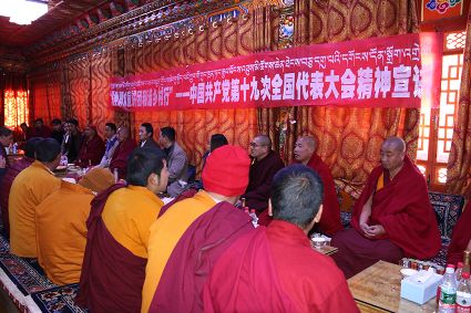 宣講團成員勇勇用藏語激情洋溢的宣講黨的十九大精神,現場不斷響起熱烈的掌聲。當勇勇講到我國五年來取得的輝煌成就時,僧人們都激動不已,紛紛為發(fā)展成就點贊?!奥犃私裉斓男v,我進一步了解到了我們國家這些年來取得的發(fā)展成就。一直以來,黨對我們的關懷是看得見摸得著的,現在我們的寺廟管理越來越規(guī)范,基礎設施也得到了完善,通往寺廟的道路也有了明顯改善,我們的生活越來越好了,這一切都是共產黨的功勞。”寺廟僧人尺乃表達著對黨的感恩。