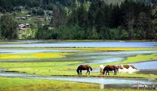 木格措一日四時(shí)景,早晚不同天:清晨,銀龍般的云霧在水面翻卷;午后,海面上無風(fēng)翻卷千堆雪;下午,海子周圍的沙灘呈現(xiàn)一片耀眼的金黃色。