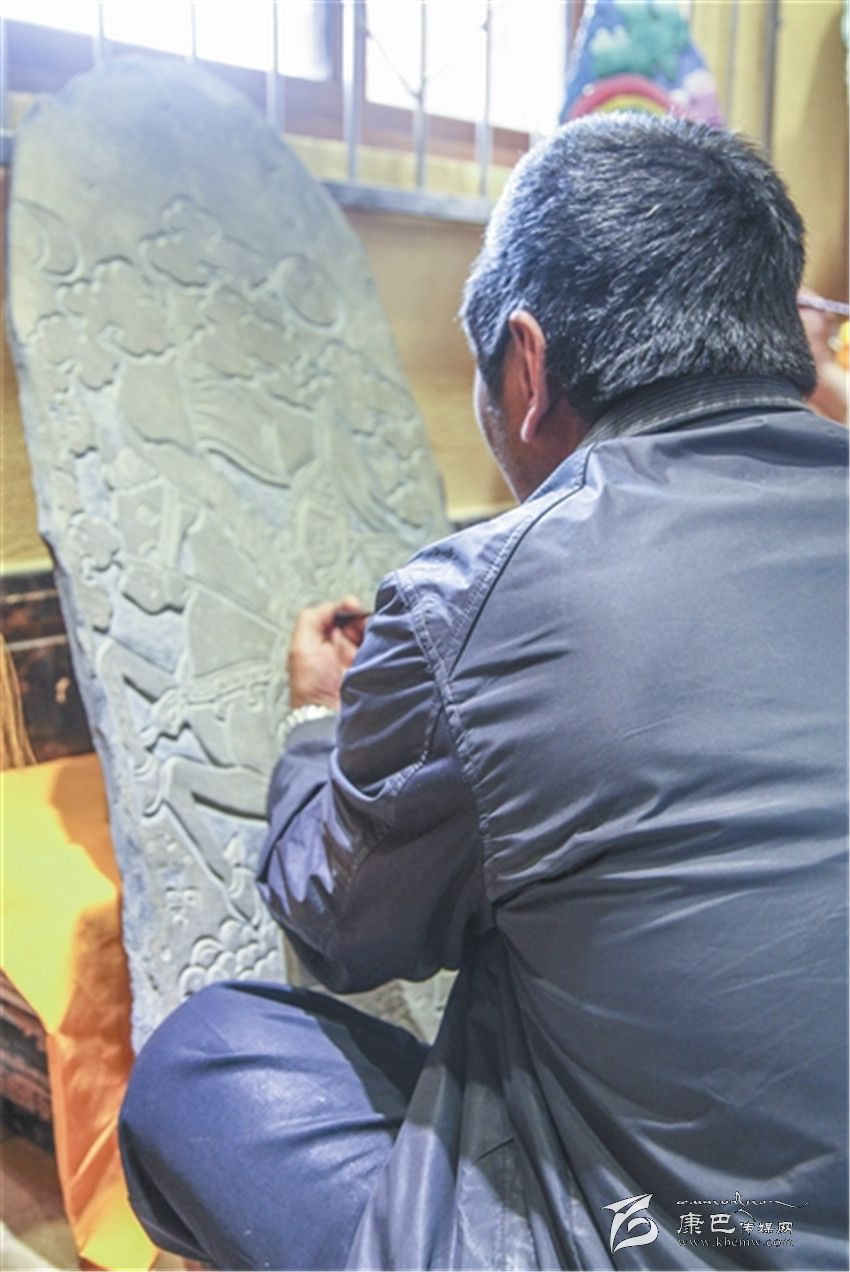 巴德告訴記者,格薩爾彩繪石刻制作工藝較為復雜,一般包括采選石料、構(gòu)圖、刻制、上色等工序。巴德說,色達縣境內(nèi)有豐富的天然頁巖資源,藝人一般就地采選石質(zhì)相對堅硬、板體形狀好的天然石板作石刻原材料。但隨著當?shù)仨搸r資源的減少,現(xiàn)在需要到道孚八美和康定塔公,甚至更遠的地方去采購石刻用石材。