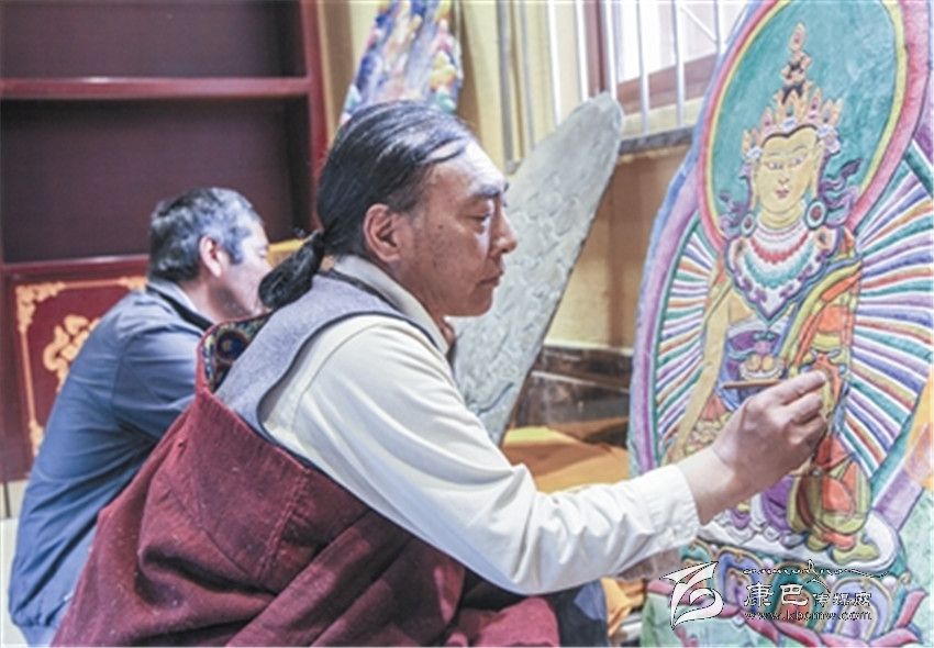 從子承父業(yè)再到吸眾家之長,自離開故鄉(xiāng)的那天起,巴德的視野開始變得開闊起來。1979年到省藏校學習藏文和美術(shù),并開始涉獵泥塑技藝,隨后又向德格民間藝人扎西澤郎學習彩繪石刻,然后又到西藏、甘肅等地學習繪畫、石刻技藝。巴德說,自己之所以有今天的藝術(shù)造詣,是因為有一批名師指點,是因為自己的不斷探索和長期堅守。讓他欣慰的是,自己的三個兒子都在學習石刻和繪畫,親戚朋友中的十多個孩子也成了他的入門弟子。