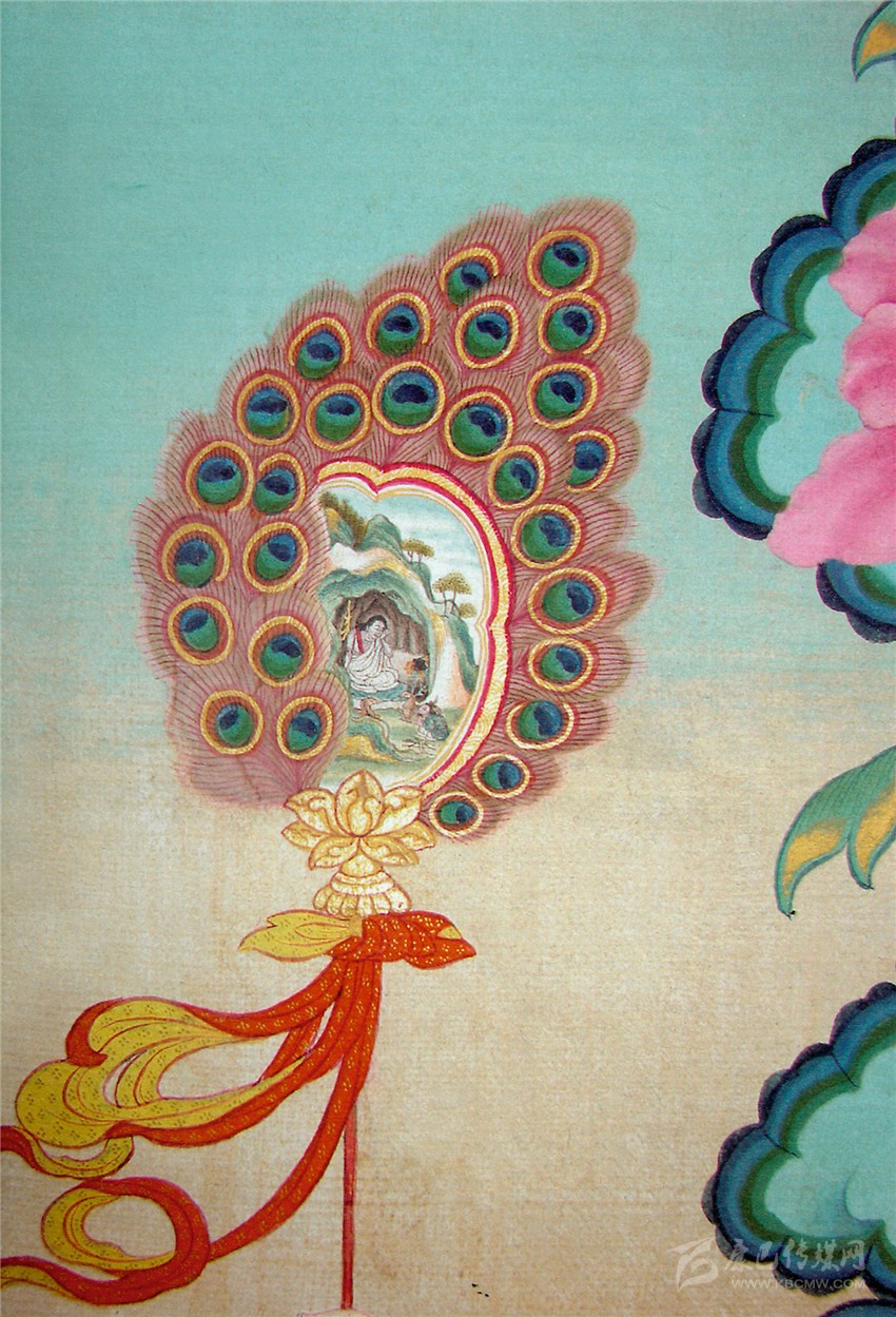 當(dāng)然,我們可以從存世的作品上印證他的這種能力。比如是在《如意寶藤之釋迦牟尼》中:左側(cè)侍女手持一把孔雀羽扇,在羽扇的中央是一塊約四平方厘米的畫屏;在這個(gè)小小的空間里面,郎卡杰描繪了一幅微縮的《修行圖》,圖中米拉日巴正在洞中苦修,洞口蹲伏著獵犬、鹿和獵人。畫中動(dòng)物與人結(jié)構(gòu)準(zhǔn)確,五官準(zhǔn)確,須發(fā)清晰,衣紋細(xì)密流暢;山洞上的樹木能區(qū)分出樹干和樹葉;天空的白云有遠(yuǎn)近層次。在這不足盈寸的空間里,用毛筆刻畫這般細(xì)致,令人嘆為觀止。