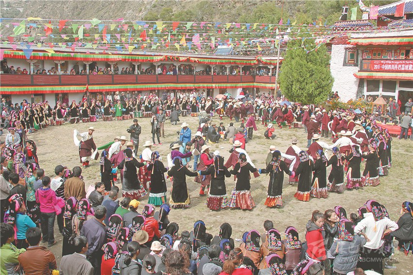 該志記述的與嘉絨鍋莊表演形式、內(nèi)容十分貼切,足見當(dāng)時(shí)嘉絨鍋莊的內(nèi)容豐富、曲調(diào)之多是任何一個(gè)舞種所不能比擬的。從這段文字描述中可以知道,嘉絨鍋舞的歌詞內(nèi)容主要包括嘉絨藏族的生息發(fā)展、歷史上的各種征戰(zhàn)、區(qū)域版圖的變遷以至四季氣候的變化、春播秋收的時(shí)間、生兒育女的賀喜、男女之間的調(diào)情、修房造物的歡慶等等。