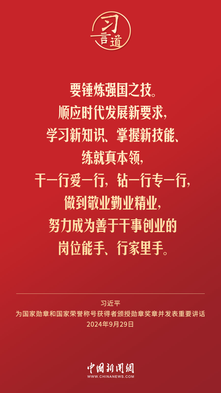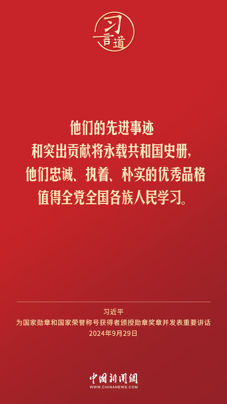 經(jīng)中共中央批準,中華人民共和國國家勛章和國家榮譽稱號頒授儀式于9月29日上午10時在人民大會堂隆重舉行。中共中央總書記、國家主席、中央軍委主席習(xí)近平向國家勛章和國家榮譽稱號獲得者分別授予“共和國勛章”“友誼勛章”和國家榮譽稱號獎?wù)虏l(fā)表重要講話。習(xí)近平指出——