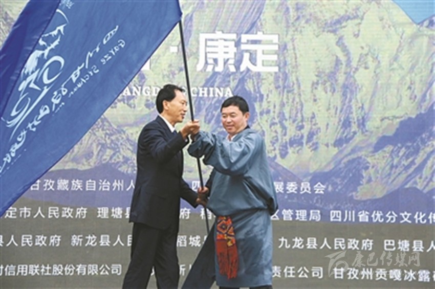 州委副書記、州政府州長肖友才向下一屆四川甘孜山地旅游節(jié)舉辦地丹巴縣交接會(huì)旗。 余秋林 記者 肖宵 攝