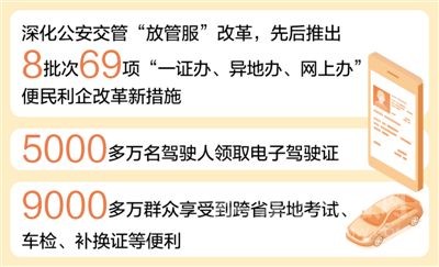 公安交管“跨省通辦”改革深入推進(jìn),駕駛證“全國通考”、機(jī)動車“全國通檢”等改革措施全面落地,已有9000多萬群眾享受到跨省異地考試、車檢、補(bǔ)換證、處理交通違法等便利,減少多次往返,更好適應(yīng)人員、貨物、車輛大流動的新形勢。