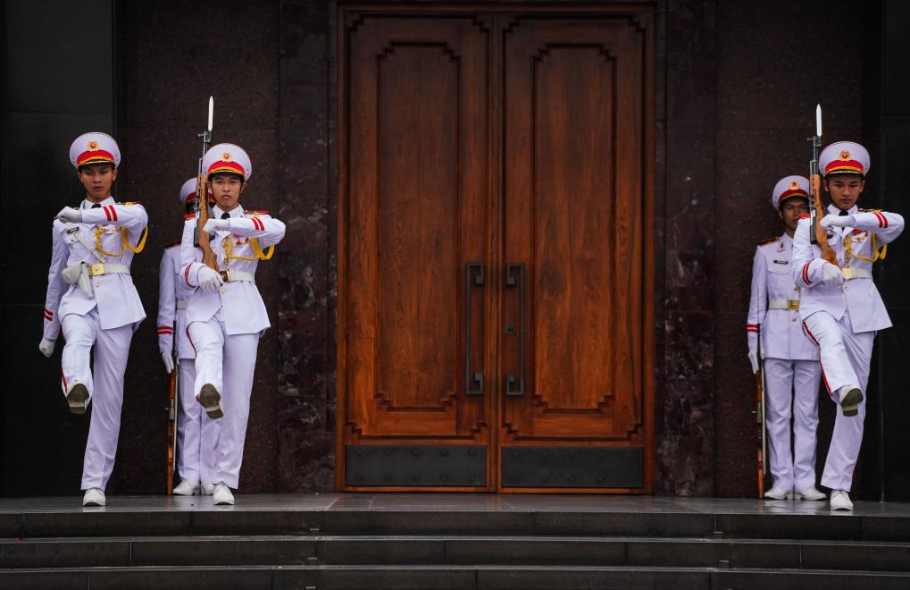 在河內(nèi)地標巴亭廣場一側,坐落著胡志明陵和胡志明故居。記者抵達廣場時,守衛(wèi)胡志明陵的儀仗兵正在舉行換崗儀式,眾多民眾和游客高舉相機或手機,記錄下這莊嚴肅穆的一刻。胡志明陵北側的胡志明故居內(nèi),各國游客排起長隊,在他曾長期居住和工作的高腳屋下駐足留影。