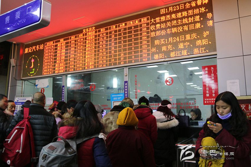 原來,汽車站售票窗口上方的視頻上滾動播放著:“因1月23日全省普降大雪,雅西高速路面結(jié)冰,收費站關(guān)閉主線封道,導(dǎo)致部分車輛沒有回康定。請購買1月24日到重慶、瀘州、南充、遂寧、綿陽、德陽、都江堰、溫江、雙流(1402次)、仁壽、眉山、西昌、宜賓、安岳、廣安的旅客到售票窗口退換車票。”