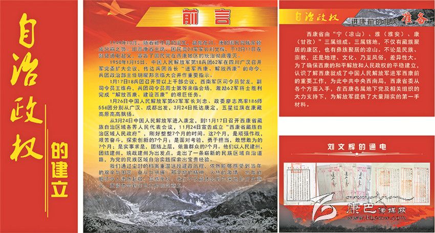 《甘孜州檔案館愛國主義教育基地》的整個展覽分為四大板塊。第一部分命名為“自治政權的建立”,向參觀者介紹了甘孜藏族自治州誕生的歷史過程;第二部分是“民主改革運動”,把人們帶回了那段不能忘記的烽火歲月;第三部分是“社會主義建設”,深情地回顧了在建設社會主義事業(yè)中我州所取得的不平凡的成就;第四部分是“改革開放”,讓人們重溫了在改革開放的大潮中所經(jīng)歷的那些充滿激情的經(jīng)歷。
