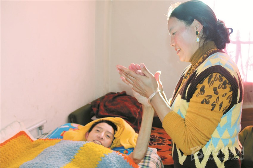 因?yàn)楦q的意外事故,家里沒有了經(jīng)濟(jì)來源。巨大的經(jīng)濟(jì)壓力,讓白措喘不過氣來。但她沒有向命運(yùn)低頭,撫育3個孩子,就近務(wù)工掙錢補(bǔ)貼家用。同時,利用工作間隙回家,照顧丈夫吃飯,給他翻身,換洗沾滿屎尿的墊布……因?yàn)閾?dān)心丈夫久臥生褥瘡和肌肉萎縮,白措每隔3小時就要給丈夫翻身,還自學(xué)了一套按摩手法替根絨全身按摩。在她的精心照料下,根絨身體慢慢得到了康復(fù)。