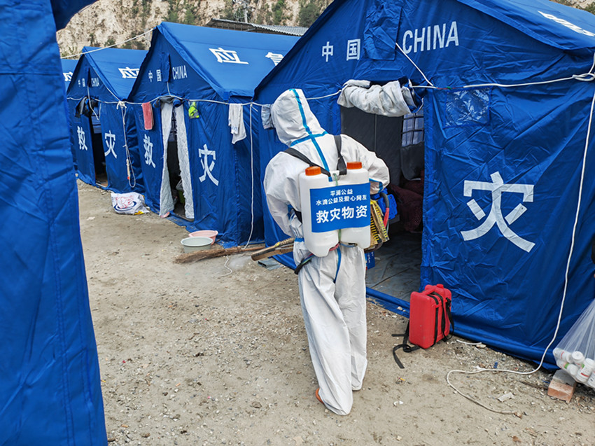 藏醫(yī)院醫(yī)務人員在地震災區(qū)進行消殺。