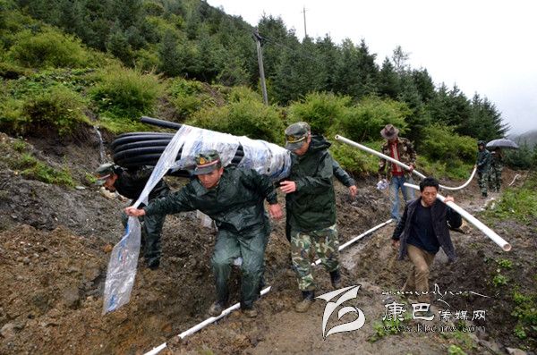 “非常感謝武警官兵!如果不是你們幫忙,我們的‘引水到村’計劃將一再推遲,影響村民的用水……”老榆林村村長項康玉感激地對官兵說。老榆林村原來的自來水飲用水源現(xiàn)已不夠用了,村民吃水面臨時斷時有的問題,為保證村民飲用水供應(yīng),由政府出資一部分,村民集資一部分,村里決定利用山頂常年的冰雪融水作為水源。前期,老榆林村已請工程隊挖好山頂至村子的2000余米的管線溝,由于連日陰雨,加之山高路險,鋪設(shè)管線工程的事一拖再拖,以致挖好的管線溝多處被雨水沖下的泥石填埋,嚴(yán)重影響飲水工程的竣工時間。村民們心里都很著急,但村里的年輕人大部分都外出打工,留守的大多是婦幼,抽不出勞力,村長項康玉無奈之下求助武警官兵。武警四川省總隊二支隊領(lǐng)導(dǎo)得知情況后,第一時間派出官兵投入老榆林村自來水管線鋪設(shè)工程。